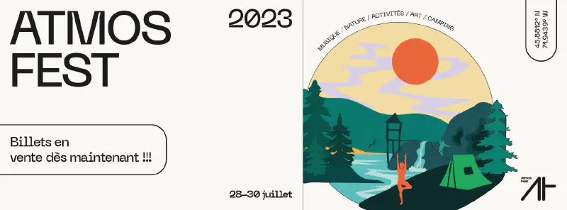 ATMOS FEST offers a unique festival experience at an incredible outdoor venue in Tingwick, a short drive east of Montreal. The venue offers multiple stages, a camping experience, a lake to canoe and swim in, a zip line over the lake, numerous workshops and day activies including massages, physio, art installations, and so much more. Put simply, you will have an unforgettable experience!